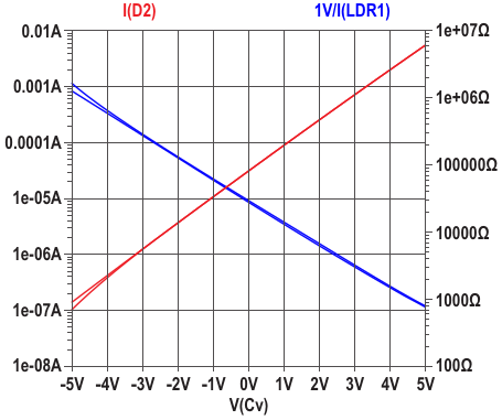 Figure 1. An exponential vactrol drive where a reference LED is used to convert a linear control voltage into an exponential current, and two matched LEDs are used for temperature compensation