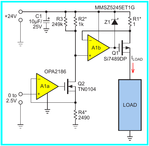 Figure 1. An improved efficiency precision current source has no overtemperature protection. With no protection, if the Q1 heatsink is inadequate, high power or ambient temperature might destroy it