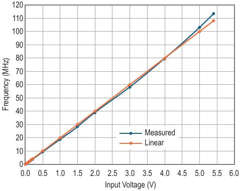 The frequency from 1.07 MHz to 103.0 MHz versus input voltage from 50 mV to 5.00 V