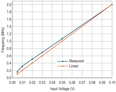 Figure 3. The frequency from 1.07 MHz to 103.0 MHz versus input voltage from 50 mV to 5.00 V