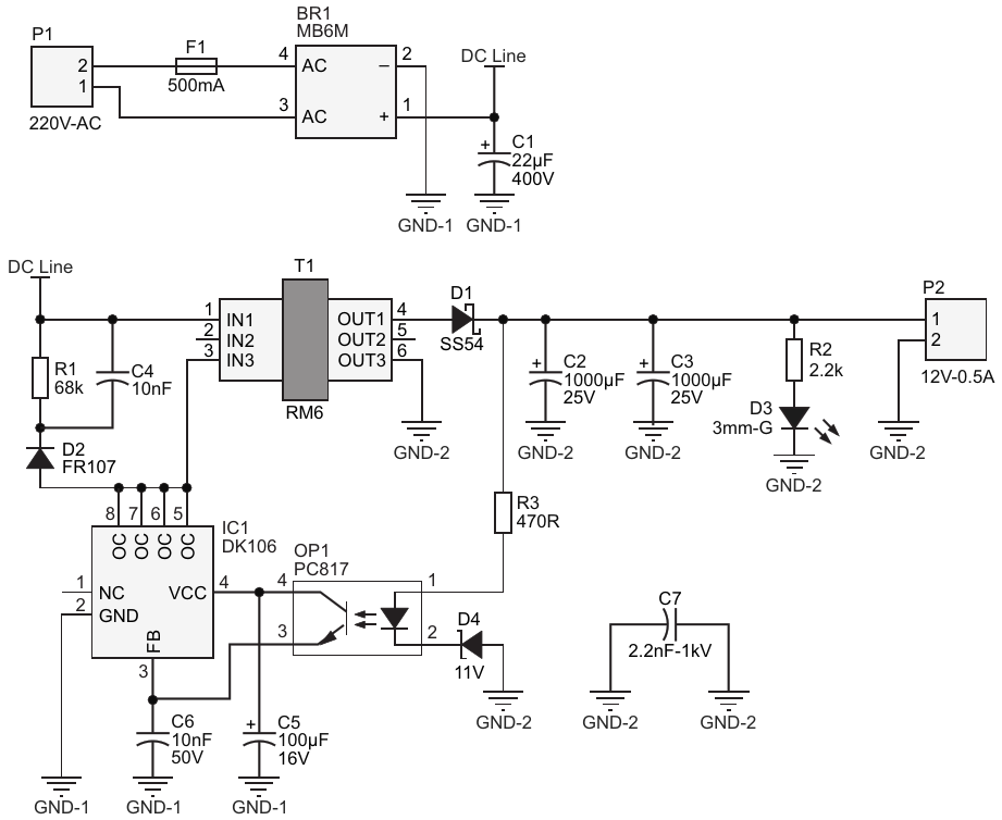 85VAC-260VAC to 12V-0.5A AC-to-DC flyback converter using an RM6 ferrite core