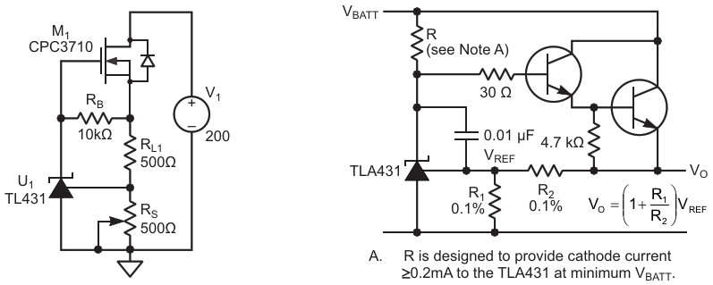 Figure 2. A current source with a more predictable current, left (IXYS) and a voltage regulator which could be employed as a current source with a more predictable current, right (Texas Instruments)