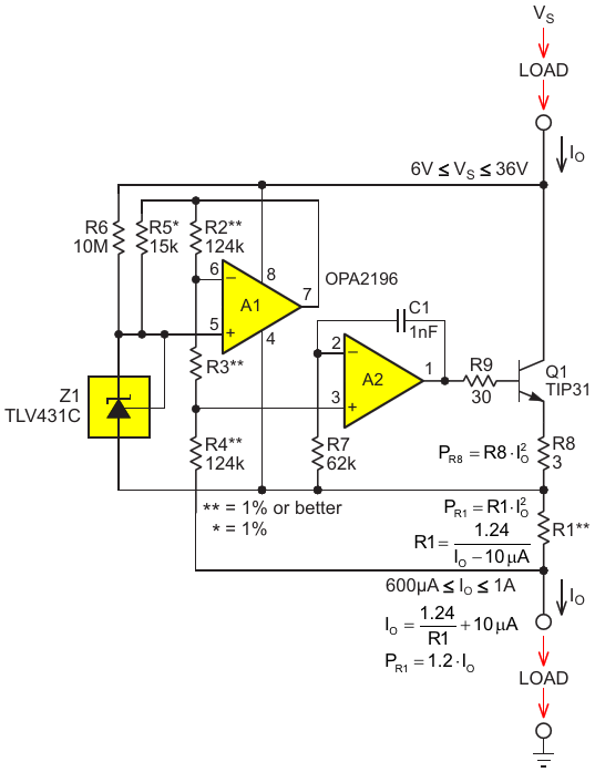Figure 1. A typical three-wire [power supply (PS), ground, and load] precision positive current source offering an accuracy of 1% or better. The output current is 1.24/R2
