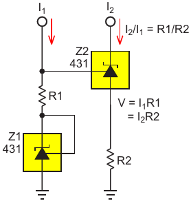 Figure 3. Add six resistors and one transistor to two TL431s to make this 0/20 mA to 4/20 mA current loop converter. Z2 sums the 500-mV offset provided by Z1 with the 0 to 2 V made by current sensor R1, then scales that with R2 to output the 4 to 20 mA with a boost