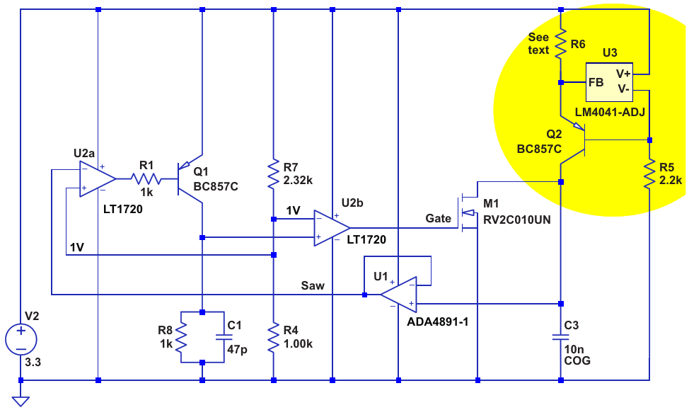 Figure 4. Maximal 5-decade sawtooth oscillator, using Christopher Paul's DI (Ref. 1)