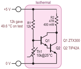 A simple oven circuit, heated by both R2 and Q2. The NTC thermistor Th1 provides feedback, the set point being determined by R1. Note how critical components are thermally tied together as they are all built onto the TO-220 package, as shown in the photos