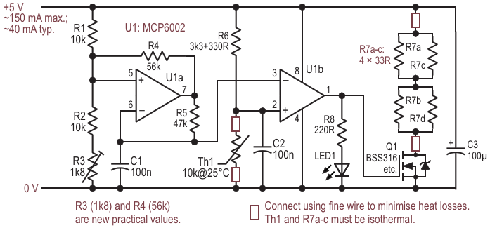 Figure 1. A tri-wave oscillator, a thermistor, and a comparator work together to pulse-width modulate the current through R7, the main heating element. Q1 switches that current and also helps with the heating