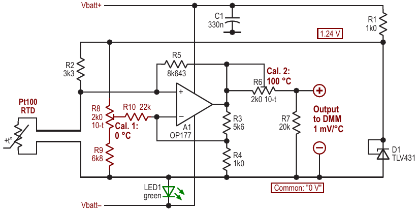 Figure 1. Using a precision op-amp lets us set the output reference level with a passive network because thermal drifts and mismatches are no longer a problem. LED1 acts both as a rail-splitter and a power indicator, while LED2 gives a simple low-battery warning. T