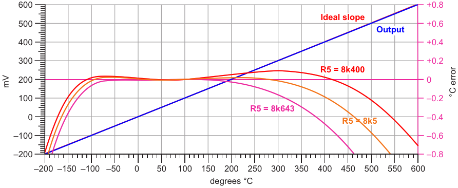 Plotting the errors for various values of R5 - the positive feedback resistor - shows that we can optimize performance for minimal errors around 0-100 °C (magenta) or accept a wider error band over a greater temperature range. The red curve is within