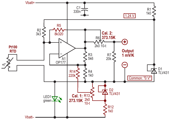 Figure 7. Referring the output from the amplifying stage to either a positive reference or to common allows the indication to be switched between Celsius and Kelvin