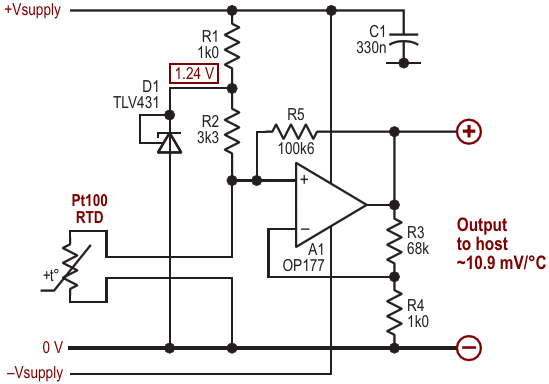 Figure 2. Adding a biasing network to A1 allows its output to be at 0 mV (common) when sensing 0 °C, and to swing negative for lower temperatures