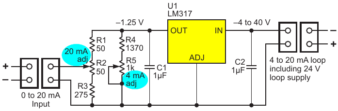 Figure 1. 0/20 mA to 4/20 mA current loop converter