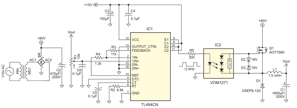Here (Figure 1), an attempt has been made to use a photovoltaic coupler (VOM1271) in a switching regulator. This coupler has a built-in fast turn-off device. With a gate capacitance of 200 pF connected to IC2, switching times tON and tOFF are 53 µs and 24 µs, respectively. Considering this, a switching frequency of 2 kHz was chosen for the buck converter. A Texas Instruments TL494 (IC1) was chosen as a pulse-width-modulation controller.