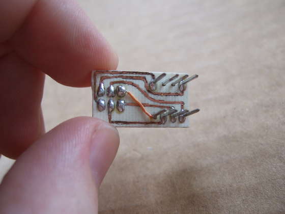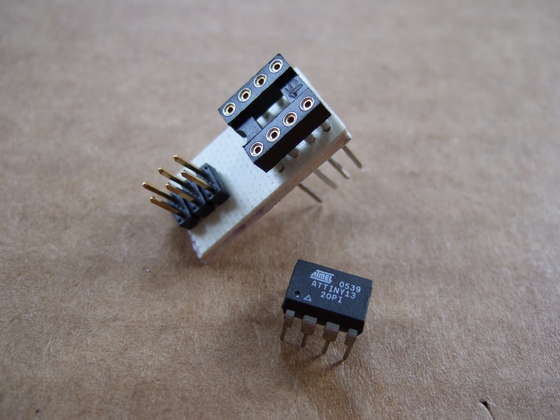 The ATTiny13/15 cradle is made with an 8-pin wire-wrap socket. I love these. It's easy to insert the chip into its nice round holes and the long legs provide extra clearance on the breadboard. I made the PCB traces by freehand with a Sharpie.