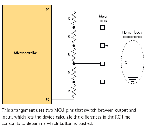 For simplicity, the example shown uses five resistors to scan four buttons (see the figure). A metal pad is created at each juncture between the resistors. When a person touches one of the metal pads, body capacitance creates an RC circuit that the MCU can sense.