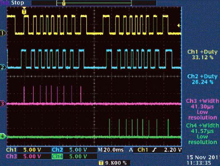| Figure 4. | These scope traces show the circuit’s response when the encoder’s shaft turns clockwise at near maximum speed. The channels are the same as in Figure 2. |