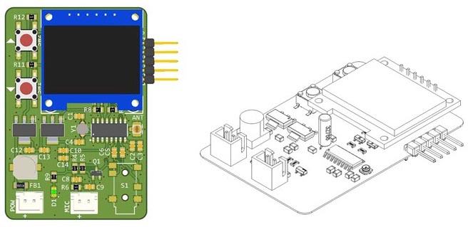 The main component of this part is the KT0803L chip (U1). S1 is an SMD headphone jack used to connect an AUX cable to the board. This allows you to transfer sound from your mobile phone, PC, or other device to the board. C5 and C6 are used to transfer the acoustic signal to U1. C2 and C3 are decoupling capacitors, and ANT is a UFL connector that provides an interface for your telescopic antenna to the board.