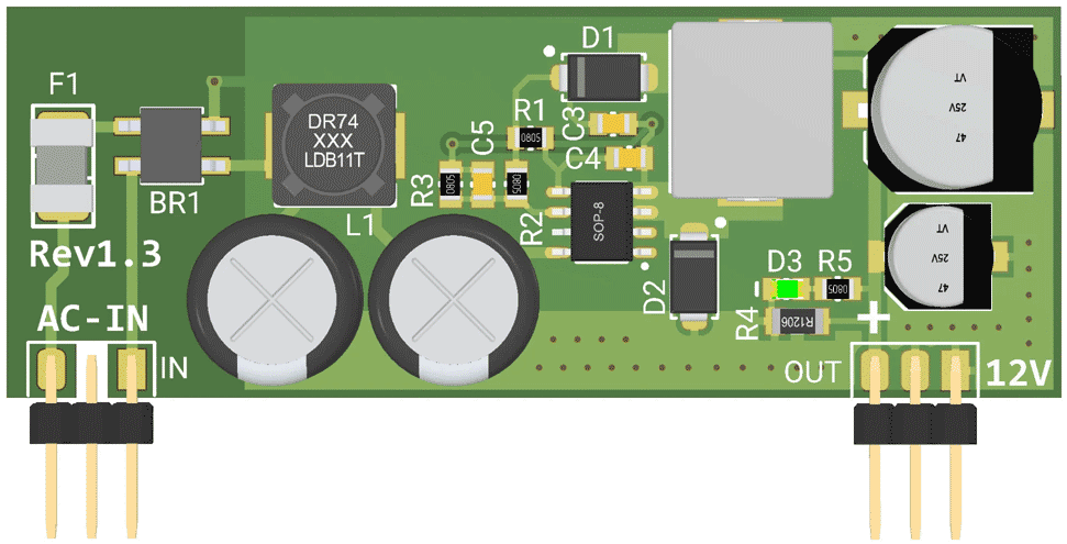 The chip man µFacturer (Diodes Incorporated) has introduced an interesting and helpful Microsoft Excel [1] file that can be used for calculation. If you look at the table, there are a few parameters that you could modify to set your desired output voltage and current. The user sets the FB pin low-side resistor and the high-side resistor is calculated by the script. For the 12 V output, the low-side resister is 4.7K and the high-side one is 18K. The output capacitors are two electrolytic-type in parallel to reduce the ESR, so the total output capacitance is 470 µF + 100 µF = 570 µF.