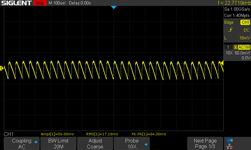 The PCB board has been tested using a DC load, an oscilloscope, and a thermal imaging camera. Figure 6 shows an infrared thermal image of the PCB board after 20 minutes of full operation (200 mA load). The highest temperature was spotted around the controller chip (51 to 52 degrees C) and the room temperature was 28 degrees C. Figure 7 shows the output noise of the power supply, at the maximum output current (around 60 mVp-p). if a lower noise level is expected, you can add one electrolytic (or an electrolytic and a ceramic capacitor in parallel) just next to your load.