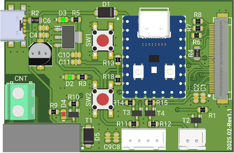 RP is the RP2040-Zero board. C3 and C5 are decoupling capacitors. D1 is the SS14 SMA Schottky diode to separate the 5 V supply of the RP2040 debugging port from the board’s supply. This separation enables the user to simultaneously power the circuit and debug the code using a PC. D2 is a blinking LED that indicates the board functions properly.