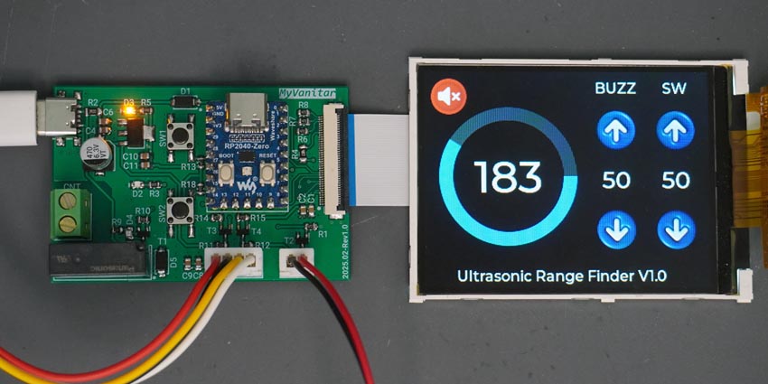 This project is an ultrasonic range finder built using the RP2040 Zero board and a 3.2-inch TFT display. It utilizes the RCWL-1655 sensor, which operates similarly to the popular HC-SR04, to measure distances ranging from 20 cm to 300 cm. The device features a relay and a buzzer, each with its distance threshold. All settings, including the thresholds and buzzer status, can be adjusted using a simple graphical user interface (GUI). The GUI (Ref. 1) is controlled using just two push buttons – one for moving between options and one for selecting them, making it easy to use.